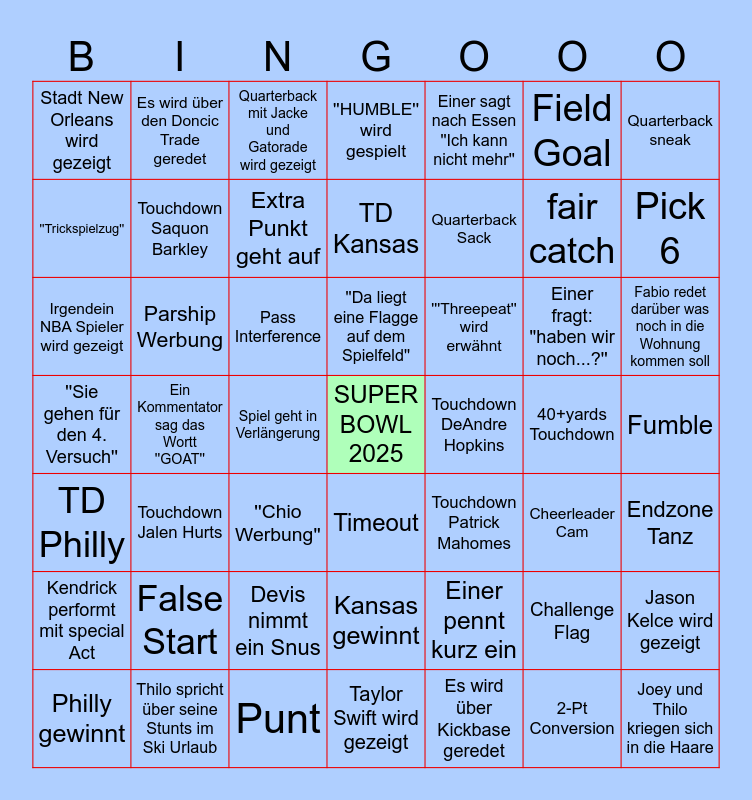 This bingo card has a free space and 48 words: Einer pennt kurz ein, fair catch, Taylor Swift wird gezeigt, Ein Kommentator sag das Wortt ''GOAT'', Pass Interference, Fumble, Es wird über den Doncic Trade geredet, Thilo spricht über seine Stunts im Ski Urlaub, Field Goal, Timeout, Quarterback sneak, ''HUMBLE'' wird gespielt, Einer fragt: ''haben wir noch...?'', '''Threepeat'' wird erwähnt, Kendrick performt mit special Act, 40+yards Touchdown, ''Trickspielzug'', Pick 6, Challenge Flag, Einer sagt nach Essen ''Ich kann nicht mehr'', Quarterback Sack, Spiel geht in Verlängerung, Stadt New Orleans wird gezeigt, Touchdown Saquon Barkley, Jason Kelce wird gezeigt, Extra Punkt geht auf, Fabio redet darüber was noch in die Wohnung kommen soll, Philly gewinnt, ''Da liegt eine Flagge auf dem Spielfeld'', Parship Werbung, 2-Pt Conversion, Touchdown DeAndre Hopkins, Endzone Tanz, False Start, ''Sie gehen für den 4. Versuch'', Touchdown Patrick Mahomes, Cheerleader Cam, Irgendein NBA Spieler wird gezeigt, ''Chio Werbung'', Devis nimmt ein Snus, TD Philly, Joey und Thilo kriegen sich in die Haare, Quarterback mit Jacke und Gatorade wird gezeigt, Punt, TD Kansas, Kansas gewinnt, Touchdown Jalen Hurts and Es wird über Kickbase geredet.