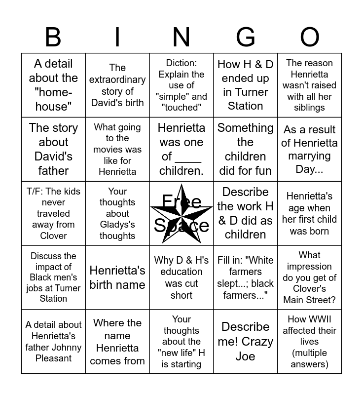 This bingo card has a free space and 24 words: Henrietta's birth name, Where the name Henrietta comes from, Henrietta was one of ____ children., A detail about Henrietta's father Johnny Pleasant, The reason Henrietta wasn't raised with all her siblings, A detail about the "home-house", The story about David's father, The extraordinary story of David's birth, Describe the work H & D did as children, Why D & H's education was cut short, Something the children did for fun, T/F: The kids never traveled away from Clover, Fill in: "White farmers slept...; black farmers...", What impression do you get of Clover's Main Street?, What going to the movies was like for Henrietta, Describe me! Crazy Joe, Henrietta's age when her first child was born, Diction: Explain the use of "simple" and "touched", As a result of Henrietta marrying Day..., Your thoughts about Gladys's thoughts, How WWII affected their lives (multiple answers), Discuss the impact of Black men's jobs at Turner Station, How H & D ended up in Turner Station and Your thoughts about the "new life" H is starting.