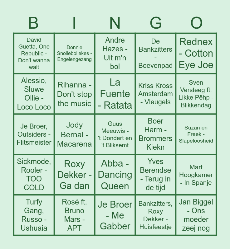 This bingo card has a free space and 24 words: Roxy Dekker - Ga dan, Rosé ft. Bruno Mars - APT, La Fuente - Ratata, Turfy Gang, Russo - Ushuaia, Rednex - Cotton Eye Joe, David Guetta, One Republic - Don't wanna wait, Alessio, Sluwe Ollie - Loco Loco, Donnie Snollebollekes - Engelengezang, Boer Harm - Brommers Kiekn, Abba - Dancing Queen, Kriss Kross Amsterdam - Vleugels, Je Broer, Outsiders - Flitsmeister, Yves Berendse - Terug in de tijd, Mart Hoogkamer - In Spanje, Rihanna - Don't stop the music, Bankzitters, Roxy Dekker - Huisfeestje, Suzan en Freek - Slapeloosheid, Andre Hazes - Uit m'n bol, Sven Versteeg ft. Likke Pêhp - Blikkendag, Jody Bernal -Macarena, Jan Biggel - Ons moeder zeej nog, Sickmode, Rooler - TOO COLD, De Bankzitters - Boevenpad and Je Broer - Me Gabber.