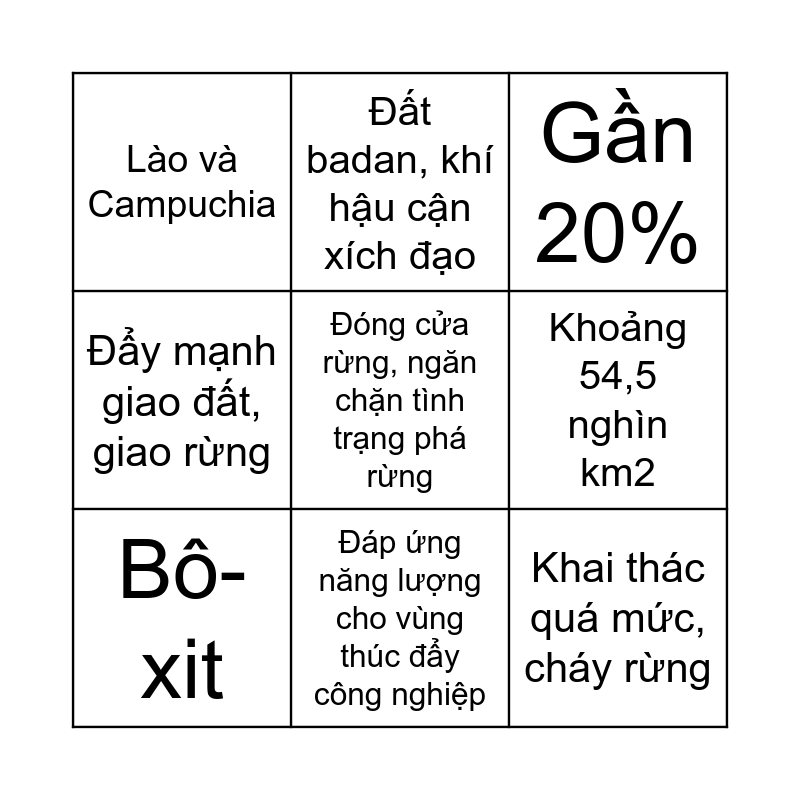 This bingo card has 13 words: Đắk Lắk, Lâm Đồng, Bô-xit, Đất badan, khí hậu cận xích đạo, Đẩy mạnh giao đất, giao rừng, Đóng cửa rừng, ngăn chặn tình trạng phá rừng, Khai thác quá mức, cháy rừng, Sông chảy qua các bậc địa hình, Đáp ứng năng lượng cho vùng thúc đẩy công nghiệp, Lào và Campuchia, Khoảng 54,5 nghìn km2, Gần 20% and TP. Đà Lạt (Lâm Đồng) và TP. Buôn Ma Thuột (Đắk Lắk).