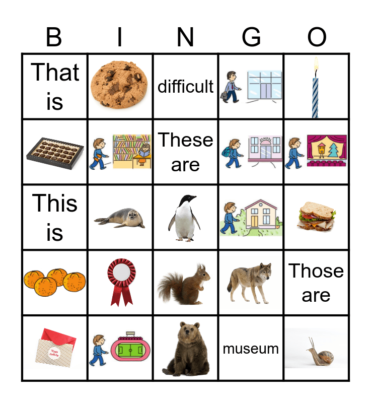 This bingo card has 19 images and 6 words: These are, That is, This is, Those are, difficult and museum.