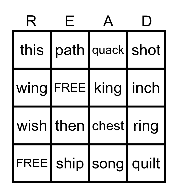 This bingo card has 16 words: ship, ring, quack, this, wish, path, chest, song, wing, FREE, FREE, shot, then, inch, king and quilt.