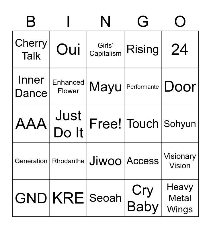 This bingo card has a free space and 91 words: Seoyeon, Hyerin, Jiwoo, Chaeyeon, Yooyeon, Soomin, Nakyoung, Yubin, Kaede, Dahyun, Kotone, Yeonji, Nien, Sohyun, Xinyu, Mayu, Lynn, Joobin, Hayeon, Shion, Chaewon, Sullin, Seoah, Jiyeon, AAA, KRE, Lovelution, Evolution, NXT, Aria, Glow, Visionary Vision, Hatchi, Generation, Cherry Talk, Rising, Girls’ Capitalism, Invincible, Just Do It, Door, GND, Inner Dance, Hit The Floor, ###Hash, Untitled, Access, Aesthetic, Assemble, Muhan, Mujuk, Assemble24, Performante, Assemble25, Rolex, Charla, Dimension, Touch, Deja-vu, Hide & Seek, Beam, Colorful, The Baddest, New Look, Chowall, Complexity, Black Soul Dress, Seoul Sonyo Sound, Cry Baby, Speed Love, Number 8, Rhodanthe, Heavy Metal Wings, 37.5, Moto Princess, Oui, Enhanced Flower, Farewell My First, Heart Raider, Midnight Flower, White Soul Sneakers, Chiyu, 24, Beyond The Beyond, Non Scale, Choom, Eclair, Love Soseol, Atmosphere, 12 Rings, Vision and Bionic Power.