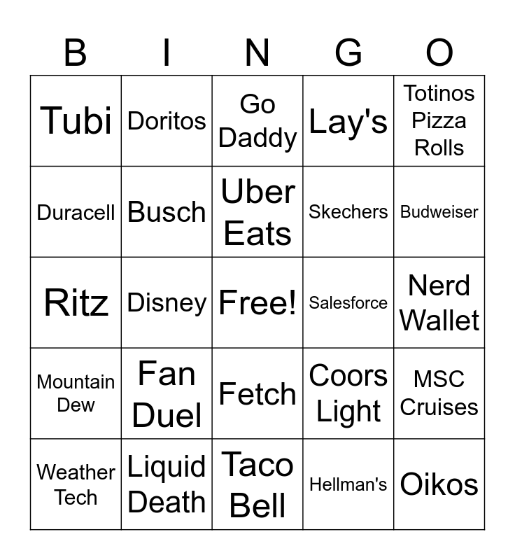 This bingo card has a free space and 24 words: Fan Duel, Liquid Death, Uber Eats, Weather Tech, Totinos Pizza Rolls, Tubi, Duracell, Doritos, Salesforce, Fetch, Skechers, Ritz, Coors Light, MSC Cruises, Busch, Hellman's, Nerd Wallet, Go Daddy, Budweiser, Disney, Oikos, Mountain Dew, Lay's and Taco Bell.