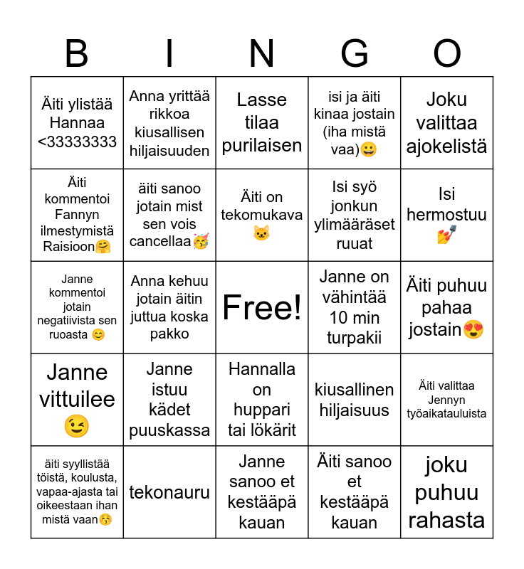 This bingo card has a free space and 24 words: Janne istuu kädet puuskassa, tekonauru, Äiti on tekomukava🐱, äiti syyllistää töistä, koulusta, vapaa-ajasta tai oikeestaan ihan mistä vaan😚, Joku valittaa ajokelistä, Äiti ylistää Hannaa <33333333, Äiti kommentoi Fannyn ilmestymistä Raisioon🤗, Anna yrittää rikkoa kiusallisen hiljaisuuden, Janne on vähintää 10 min turpakii, Hannalla on huppari tai lökärit, Isi syö jonkun ylimääräset ruuat, Janne kommentoi jotain negatiivista sen ruoasta 😊, kiusallinen hiljaisuus, Äiti valittaa Jennyn työaikatauluista, äiti sanoo jotain mist sen vois cancellaa🥳, Äiti sanoo et kestääpä kauan, Äiti puhuu pahaa jostain😍, Lasse tilaa purilaisen, Isi hermostuu💅, Anna kehuu jotain äitin juttua koska pakko, joku puhuu rahasta, Janne vittuilee😉, isi ja äiti kinaa jostain (iha mistä vaa)😀 and Janne sanoo et kestääpä kauan.