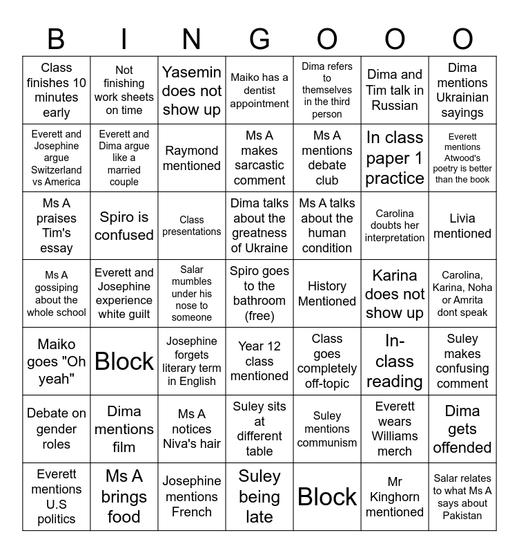 This bingo card has a free space and 48 words: Suley mentions communism, In class paper 1 practice, Suley being late, Everett and Josephine experience white guilt, Class presentations, Carolina, Karina, Noha or Amrita dont speak, Not finishing work sheets on time, Ms A brings food, Dima and Tim talk in Russian, Year 12 class mentioned, Dima mentions Ukrainian sayings, Maiko has a dentist appointment, Carolina doubts her interpretation, Ms A talks about the human condition, Debate on gender roles, Karina does not show up, Everett and Josephine argue Switzerland vs America, Everett mentions Atwood's poetry is better than the book, Everett wears Williams merch, Dima refers to themselves in the third person, Ms A mentions debate club, Salar mumbles under his nose to someone, Class finishes 10 minutes early, Everett and Dima argue like a married couple, Dima gets offended, Raymond mentioned, Livia mentioned, Everett mentions U.S politics, Dima talks about the greatness of Ukraine, Spiro is confused, Mr Kinghorn mentioned, History Mentioned, Suley makes confusing comment, Dima mentions film, Ms A gossiping about the whole school, Class goes completely off-topic, In-class reading, Ms A praises Tim's essay, Josephine forgets literary term in English, Ms A notices Niva's hair, Maiko goes "Oh yeah", Salar relates to what Ms A says about Pakistan, Yasemin does not show up, Josephine mentions French, Ms A makes sarcastic comment, Suley sits at different table, Block and Block.