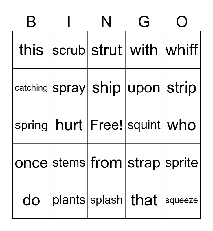 This bingo card has a free space and 24 words: stems, plants, ship, do, whiff, this, catching, scrub, squint, from, upon, spring, strap, sprite, spray, that, who, strut, strip, hurt, squeeze, once, with and splash.