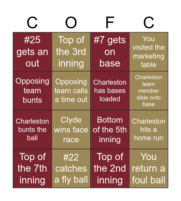 This bingo card has 23 words: You are wearing CofC Softball gear, Charleston makes a double play, Bottom of the 5th inning, You return a foul ball, Charleston bunts the ball, Top of the 3rd inning, #7 gets on base, You visited the marketing table, Top of the 7th inning, #22 catches a fly ball, Top of the 2nd inning, Charleston team member slide onto base, Charleston calls a time out, #20 hits a line drive, Face race happens, #19 Pitches a strikeout, #25 gets an out, Opposing team calls a time out, Charleston has bases loaded, Charleston hits a home run, Opposing team bunts, Clyde wins face race and What's in your pocket game takes place.