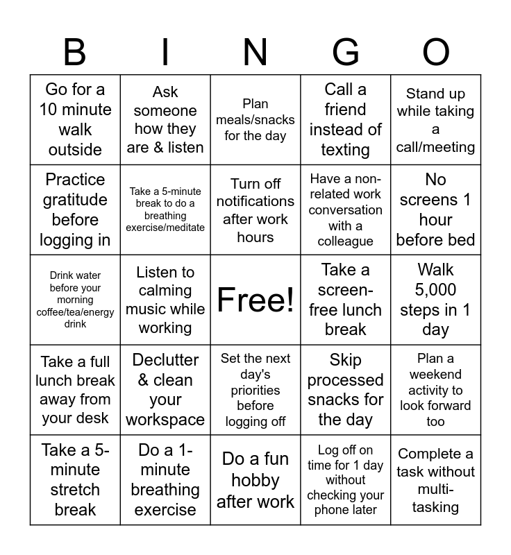 This bingo card has a free space and 29 words: Take a 5-minute stretch break, Get at least 7 hours of sleep, Listen to calming music while working, Compliment someone's work or show appreciation for them, Go for a 10 minute walk outside, Plan meals/snacks for the day, Take a 5-minute break to do a breathing exercise/meditate, Declutter & clean your workspace, Take a screen-free lunch break, Do a 1-minute breathing exercise, Walk 5,000 steps in 1 day, Complete a task without multi-tasking, Do a fun hobby after work, Log off on time for 1 day without checking your phone later, No screens 1 hour before bed, Do 10 squats or push-ups, Set the next day's priorities before logging off, Take a full lunch break away from your desk, Stand up while taking a call/meeting, Drink water before your morning coffee/tea/energy drink, Skip processed snacks for the day, Write down 3 things you accomplished at the end of the day, Have a non-related work conversation with a colleague, Practice gratitude before logging in, Call a friend instead of texting, Ask someone how they are & listen, Plan a weekend activity to look forward too, Turn off notifications after work hours and Spend quality time with loved ones.