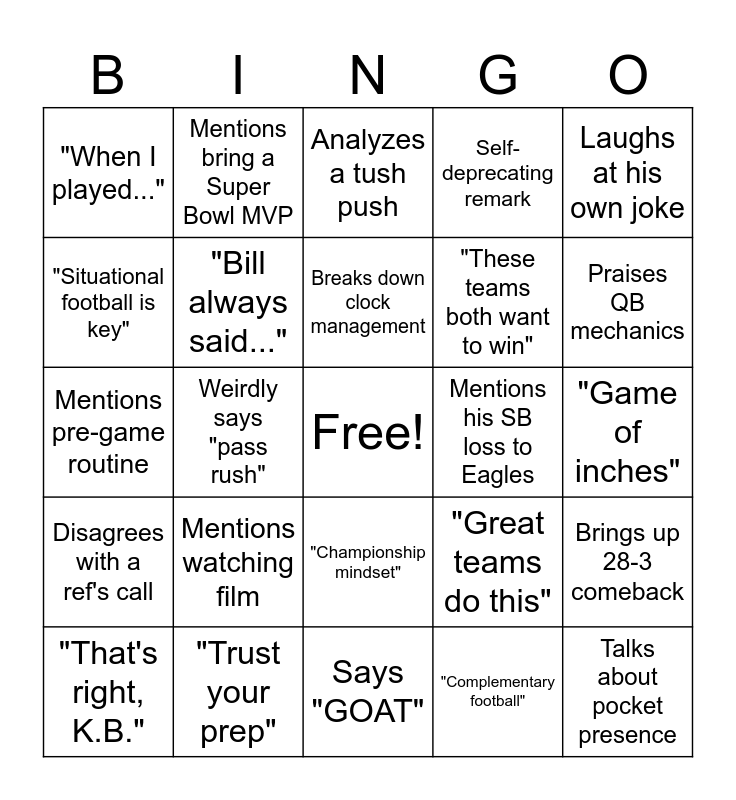 This bingo card has a free space and 24 words: Mentions watching film, "Trust your prep", Breaks down clock management, "That's right, K.B.", Laughs at his own joke, "When I played...", "Situational football is key", Mentions bring a Super Bowl MVP, Mentions his SB loss to Eagles, "Championship mindset", "These teams both want to win", Mentions pre-game routine, "Great teams do this", Brings up 28-3 comeback, "Bill always said...", "Complementary football", "Game of inches", Analyzes a tush push, Praises QB mechanics, Weirdly says "pass rush", Talks about pocket presence, Disagrees with a ref's call, Self-deprecating remark and Says "GOAT".