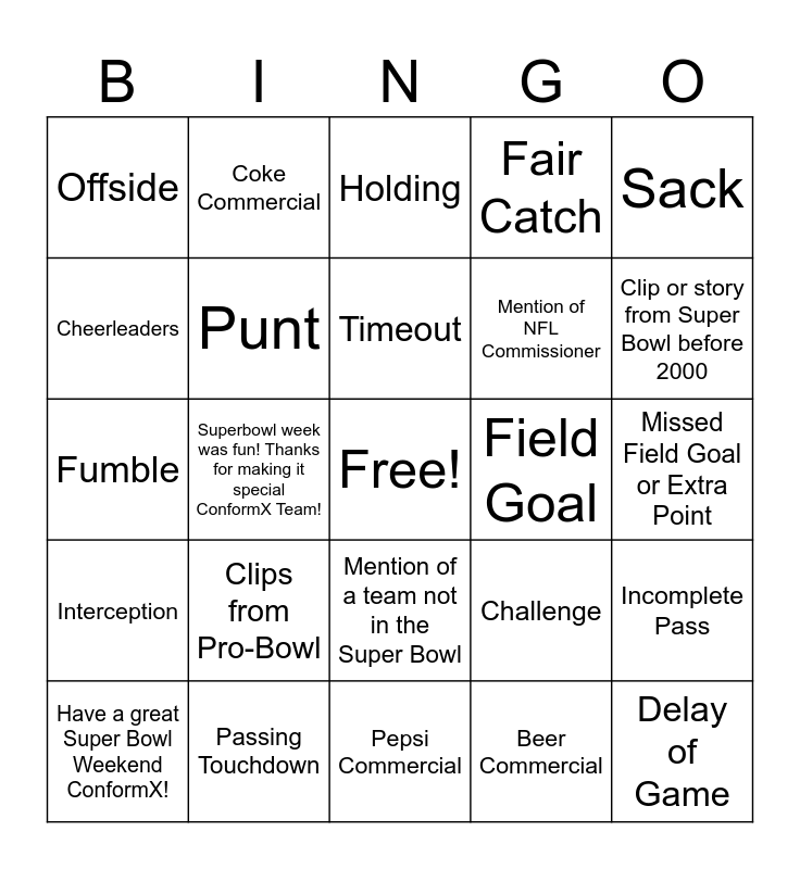 This bingo card has a free space and 27 words: Rushing Touchdown, Passing Touchdown, Timeout, Beer Commercial, Sack, Cheerleaders, Coke Commercial, Pepsi Commercial, Field Goal, Incomplete Pass, Interception, Punt, Challenge, Delay of Game, Fumble, Extra Point, Holding, Fair Catch, Missed Field Goal or Extra Point, Offside, Clips from Pro-Bowl, Mention of a team not in the Super Bowl, Mention of NFL Commissioner, Clip or story from Super Bowl before 2000, Have a great Super Bowl Weekend ConformX!, Superbowl week was fun! Thanks for making it special ConformX Team! and Eat some great food this weekend ConformX Team! 😊.