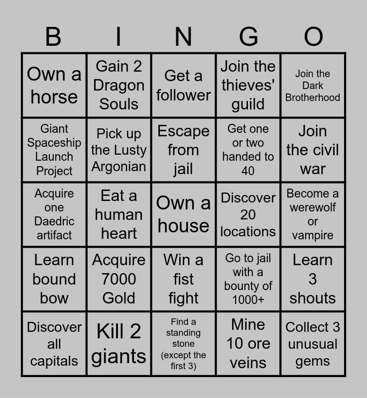 This bingo card has 25 words: Learn bound bow, Kill 2 giants, Own a house, Mine 10 ore veins, Join the Dark Brotherhood, Own a horse, Gain 2 Dragon Souls, Get a follower, Discover 20 locations, Learn 3 shouts, Giant Spaceship Launch Project, Pick up the Lusty Argonian, Find a standing stone (except the first 3), Go to jail with a bounty of 1000+, Join the civil war, Discover all capitals, Eat a human heart, Escape from jail, Get one or two handed to 40, Become a werewolf or vampire, Acquire one Daedric artifact, Acquire 7000 Gold, Win a fist fight, Join the thieves' guild and Collect 3 unusual gems.