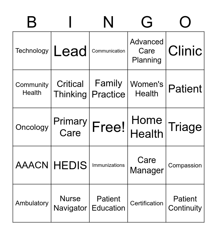 This bingo card has a free space and 31 words: Patient Education, Depression Screening, Primary Care, Specialty Clinics, Technology, Communication, Critical Thinking, Care Manager, Home Health, Certification, Triage, Patient Continuity, Anticoag, Work/ Life Balance, Patient, Internship, Compassion, HEDIS, AAACN, Immunizations, Clinic, Pediatric, Ambulatory, Lead, Women's Health, Community Health, Advanced Care Planning, Oncology, Nurse Navigator, Family Practice and Medicare Wellness.