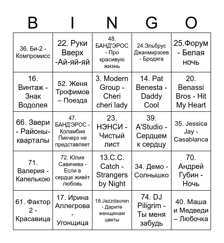 This bingo card has 75 words: 1. Татьяна Буланова - Мой ненаглядный, 2. Be My Lover, 3. Modern Group - Cheri cheri lady, 4. Mr. President - Coco Jamboo, 5. Ирина Аллегрова - Младший лейтенант, 6. Краски - Сегодня К Маме Я Приехала Домой, 7. Согдиана - Синее небо, 8. Виктория Дайнеко - Дыши, 9. Максим - Знаешь ли ты, 10. Звери - До скорой встречи, 11.Minelli - Rampampam, 12.Каролина - На дискотеке, 13.C.C. Catch - Strangers by Night, 14. Pat Benesta - Daddy Cool, 15. Сплин - Моё сердце, 16. Винтаж - Знак Водолея, 17. Ирина Аллегрова - Угонщица, 18.Jazzdauren - Дарите женщинам цветы, 19. ABBA - Gimme! Gimme! Gimme!, 20. Benassi Bros - Hit My Heart, 21. Чи-Ли - Лето, 22. Руки Вверх -Ай-яй-яй, 23. НЭНСИ - Чистый лист, 24.Эльбрус Джанмирзоев - Бродяга, 25.Форум - Белая ночь, 26.Сергей Лазарев - В Самое Сердце, 27. Чай вдвоём - Белое платье, 28. Татьяна Буланова - Ясный мой свет, 29. Андрей Губин - Девушки как звёзды, 30. Комбинация - Russian girls, 31. DJ SMASH -Moscow Never Sleeps, 32. Валерий Меладзе - Салют, Вера, 33. Валерий Меладзе - Текила-любовь, 34. Демо - Солнышко, 35. Jessica Jay - Casablanca, 36. Би-2 - Компромисс, 37. Валерий Меладзе - Свет уходящего солнца, 38. A'Studio - Улетаю, 39. A'Studio - Сердцем к сердцу, 40. Маша и Медведи – Любочка, 41. Винтаж, Ева Польна - Eva, 42. Блестящие - Восточные сказки, 43. Ace of Base - All That She Wants, 44. Corona - The Rhythm of the Night, 45. Дискотека Авария, Жанна Фриске - Малинки, 46. SEREBRO - Мама Люба, 47. БАНД'ЭРОС - Коламбия Пикчерз не представляет, 48. БАНД'ЭРОС - Про красивую жизнь, 49. Мираж - Музыка нас связала, 50. Мираж - Новый герой, 51. Руки Вверх – танцуй, 52. Женя Трофимов – Поезда, 53. Моя Мишель - Зима, 54. Султан Лагучев - Попутчица, 55. Максим – Трудный возраст, 56. Reflex– Non stop, 57. Reflex – Танцы, 58. Пропаганда - Супердетка, 59. Пропаганда - Яй-Я, 60. Краски - Оранжевое Солнце, 61. Фактор 2 - Красавица, 62. Глюк'oZa - Жениха хотела, 63. Бьянка – Были танцы, 64. SEREBRO – Сладко, 65. Quest Pistols Show - Белая стрекоза любви, 66. Звери - Районы-кварталы, 67. Верка Сердючка - Чита - дрита, 68. ВИА ГРА - Я не поняла!, 69. Верка Сердючка - Все будет хорошо, 70. Андрей Губин - Ночь, 71. Валерия - Капелькою, 72. Юлия Савичева - Если в сердце живёт любовь, 73. Сергей Васюта - На белом покрывале, 74. DJ Piligrim - Ты меня забудь and 75. Paradisio - Bailando.