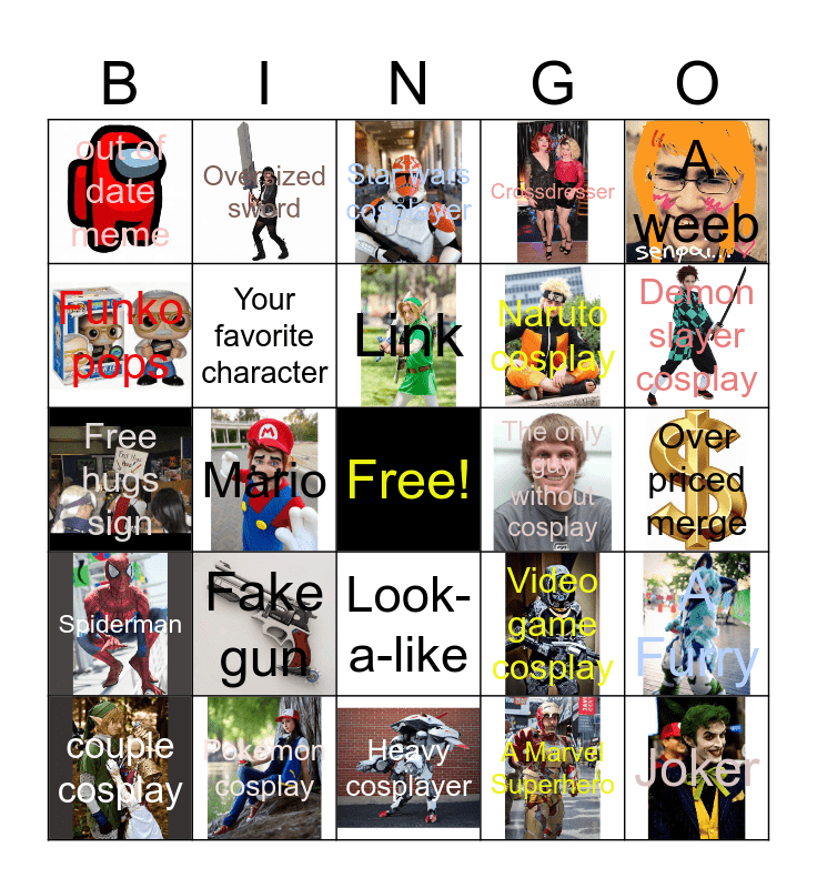This bingo card has 26 images, a free space and 28 words: A Furry, Genshin impact, Naruto cosplay, A Marvel Superhero, Funko pops, Star wars cosplayer, Oversized sword, Spiderman, The only guy without cosplay, couple cosplay, Free hugs sign, Crossdresser, Pokémon cosplay, Heavy cosplayer, Demon slayer cosplay, HxH cosplay, Fake gun, Your favorite character, Link, Look-a-like, out of date meme, A group cosplay, Joker, Mario, Over priced merge, Video game cosplay, A weeb and Giant poster.