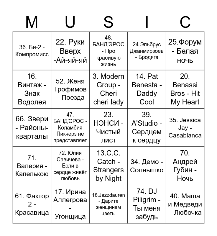 This bingo card has 75 words: 1. Татьяна Буланова - Мой ненаглядный, 2. Be My Lover, 3. Modern Group - Cheri cheri lady, 4. Mr. President - Coco Jamboo, 5. Ирина Аллегрова - Младший лейтенант, 6. Краски - Сегодня К Маме Я Приехала Домой, 7. Согдиана - Синее небо, 8. Виктория Дайнеко - Дыши, 9. Максим - Знаешь ли ты, 10. Звери - До скорой встречи, 11.Minelli - Rampampam, 12.Каролина - На дискотеке, 13.C.C. Catch - Strangers by Night, 14. Pat Benesta - Daddy Cool, 15. Сплин - Моё сердце, 16. Винтаж - Знак Водолея, 17. Ирина Аллегрова - Угонщица, 18.Jazzdauren - Дарите женщинам цветы, 19. ABBA - Gimme! Gimme! Gimme!, 20. Benassi Bros - Hit My Heart, 21. Чи-Ли - Лето, 22. Руки Вверх -Ай-яй-яй, 23. НЭНСИ - Чистый лист, 24.Эльбрус Джанмирзоев - Бродяга, 25.Форум - Белая ночь, 26.Сергей Лазарев - В Самое Сердце, 27. Чай вдвоём - Белое платье, 28. Татьяна Буланова - Ясный мой свет, 29. Андрей Губин - Девушки как звёзды, 30. Комбинация - Russian girls, 31. DJ SMASH -Moscow Never Sleeps, 32. Валерий Меладзе - Салют, Вера, 33. Валерий Меладзе - Текила-любовь, 34. Демо - Солнышко, 35. Jessica Jay - Casablanca, 36. Би-2 - Компромисс, 37. Валерий Меладзе - Свет уходящего солнца, 38. A'Studio - Улетаю, 39. A'Studio - Сердцем к сердцу, 40. Маша и Медведи – Любочка, 41. Винтаж, Ева Польна - Eva, 42. Блестящие - Восточные сказки, 43. Ace of Base - All That She Wants, 44. Corona - The Rhythm of the Night, 45. Дискотека Авария, Жанна Фриске - Малинки, 46. SEREBRO - Мама Люба, 47. БАНД'ЭРОС - Коламбия Пикчерз не представляет, 48. БАНД'ЭРОС - Про красивую жизнь, 49. Мираж - Музыка нас связала, 50. Мираж - Новый герой, 51. Руки Вверх – танцуй, 52. Женя Трофимов – Поезда, 53. Моя Мишель - Зима, 54. Султан Лагучев - Попутчица, 55. Максим – Трудный возраст, 56. Reflex– Non stop, 57. Reflex – Танцы, 58. Пропаганда - Супердетка, 59. Пропаганда - Яй-Я, 60. Краски - Оранжевое Солнце, 61. Фактор 2 - Красавица, 62. Глюк'oZa - Жениха хотела, 63. Бьянка – Были танцы, 64. SEREBRO – Сладко, 65. Quest Pistols Show - Белая стрекоза любви, 66. Звери - Районы-кварталы, 67. Верка Сердючка - Чита - дрита, 68. ВИА ГРА - Я не поняла!, 69. Верка Сердючка - Все будет хорошо, 70. Андрей Губин - Ночь, 71. Валерия - Капелькою, 72. Юлия Савичева - Если в сердце живёт любовь, 73. Сергей Васюта - На белом покрывале, 74. DJ Piligrim - Ты меня забудь and 75. Paradisio - Bailando.