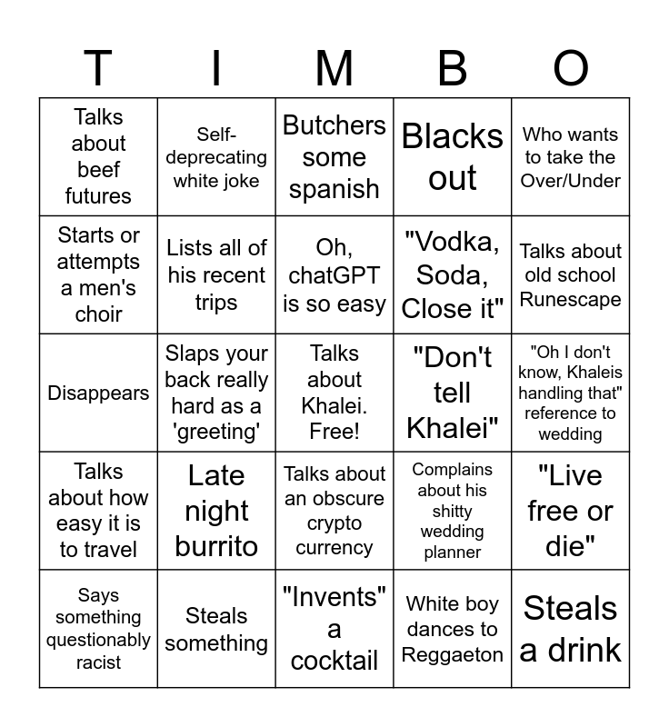 This bingo card has a free space and 33 words: Calls himself "titti boi", Dons viper shades, Slaps your back really hard as a 'greeting', Waxes rhapsodic about lake Cuomo, Talks about how easy it is to travel, Lists all of his recent trips, Who wants to take the Over/Under, Says something questionably racist, Self-deprecating white joke, Complains about home ownership, Oh, chatGPT is so easy, Butchers some spanish, Complains about airline fees, Threatens to charge you, "Don't tell Khalei", Talks about old school Runescape, Steals something, Disappears, Late night burrito, Complains about his shitty wedding planner, Talks about an obscure crypto currency, "BOIIIIS NIIIIGHT", Talks about beef futures, "Oh I don't know, Khaleis handling that" reference to wedding, "Invents" a cocktail, Steals a drink, Blacks out, "Vodka, Soda, Close it", Starts or attempts a men's choir, "Live free or die", Eats junk food, immediately complains, White boy dances to Reggaeton and Gets antsy at a bar and wants to move on.