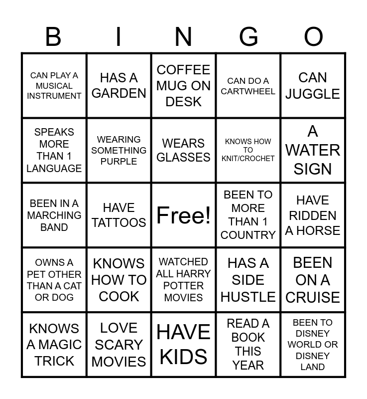 This bingo card has a free space and 24 words: KNOWS HOW TO COOK, LOVE SCARY MOVIES, WEARS GLASSES, KNOWS A MAGIC TRICK, CAN JUGGLE, CAN PLAY A MUSICAL INSTRUMENT, SPEAKS MORE THAN 1 LANGUAGE, HAS A GARDEN, BEEN TO MORE THAN 1 COUNTRY, WATCHED ALL HARRY POTTER MOVIES, KNOWS HOW TO KNIT/CROCHET, BEEN IN A MARCHING BAND, HAS A SIDE HUSTLE, BEEN ON A CRUISE, WEARING SOMETHING PURPLE, READ A BOOK THIS YEAR, HAVE RIDDEN A HORSE, COFFEE MUG ON DESK, A WATER SIGN, HAVE TATTOOS, BEEN TO DISNEY WORLD OR DISNEY LAND, OWNS A PET OTHER THAN A CAT OR DOG, CAN DO A CARTWHEEL and HAVE KIDS.