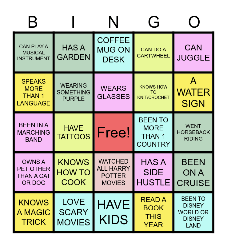 This bingo card has a free space and 24 words: KNOWS HOW TO COOK, LOVE SCARY MOVIES, WEARS GLASSES, KNOWS A MAGIC TRICK, CAN JUGGLE, CAN PLAY A MUSICAL INSTRUMENT, SPEAKS MORE THAN 1 LANGUAGE, HAS A GARDEN, BEEN TO MORE THAN 1 COUNTRY, WATCHED ALL HARRY POTTER MOVIES, KNOWS HOW TO KNIT/CROCHET, BEEN IN A MARCHING BAND, HAS A SIDE HUSTLE, BEEN ON A CRUISE, WEARING SOMETHING PURPLE, READ A BOOK THIS YEAR, WENT HORSEBACK RIDING, COFFEE MUG ON DESK, A WATER SIGN, HAVE TATTOOS, BEEN TO DISNEY WORLD OR DISNEY LAND, OWNS A PET OTHER THAN A CAT OR DOG, CAN DO A CARTWHEEL and HAVE KIDS.
