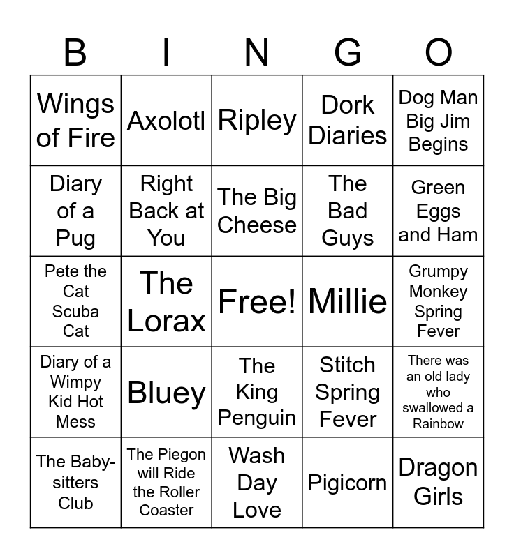 This bingo card has a free space and 24 words: Bluey, The Piegon will Ride the Roller Coaster, The Big Cheese, The Baby-sitters Club, Dog Man Big Jim Begins, Wings of Fire, Diary of a Pug, Axolotl, Millie, The King Penguin, The Bad Guys, Pete the Cat Scuba Cat, Stitch Spring Fever, There was an old lady who swallowed a Rainbow, Right Back at You, Pigicorn, Grumpy Monkey Spring Fever, Ripley, Green Eggs and Ham, The Lorax, Dragon Girls, Diary of a Wimpy Kid Hot Mess, Dork Diaries and Wash Day Love.