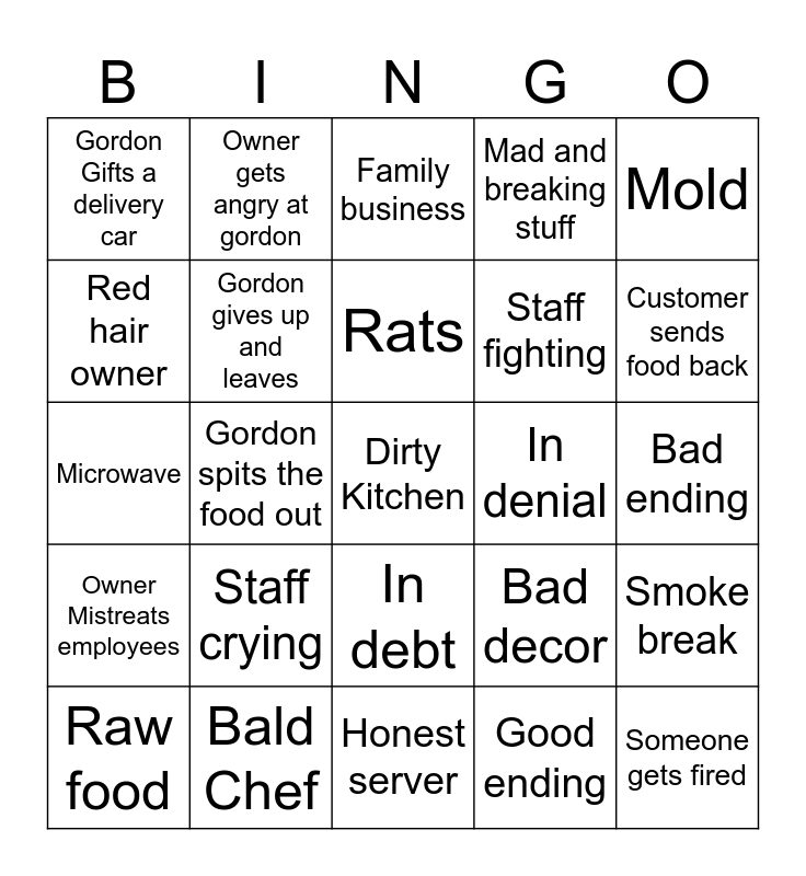 This bingo card has a free space and 24 words: Staff crying, Bald Chef, Rats, Raw food, Mold, Gordon Gifts a delivery car, Red hair owner, Owner gets angry at gordon, In denial, In debt, Staff fighting, Microwave, Bad decor, Smoke break, Gordon gives up and leaves, Good ending, Bad ending, Family business, Customer sends food back, Gordon spits the food out, Someone gets fired, Owner Mistreats employees, Mad and breaking stuff and Honest server.
