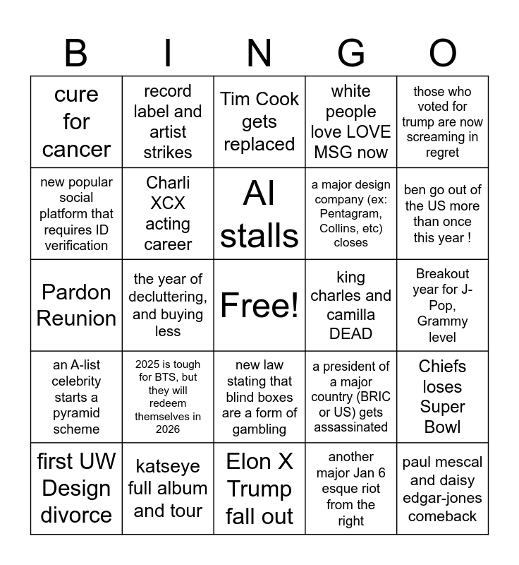 This bingo card has a free space and 24 words: 2025 is tough for BTS, but they will redeem themselves in 2026, katseye full album and tour, AI stalls, first UW Design divorce, those who voted for trump are now screaming in regret, cure for cancer, new popular social platform that requires ID verification, record label and artist strikes, king charles and camilla DEAD, new law stating that blind boxes are a form of gambling, a major design company (ex: Pentagram, Collins, etc) closes, Pardon Reunion, a president of a major country (BRIC or US) gets assassinated, Chiefs loses Super Bowl, Charli XCX acting career, another major Jan 6 esque riot from the right, Breakout year for J-Pop, Grammy level, Tim Cook gets replaced, ben go out of the US more than once this year !, the year of decluttering, and buying less, paul mescal and daisy edgar-jones comeback, an A-list celebrity starts a pyramid scheme, white people love LOVE MSG now and Elon X Trump fall out.