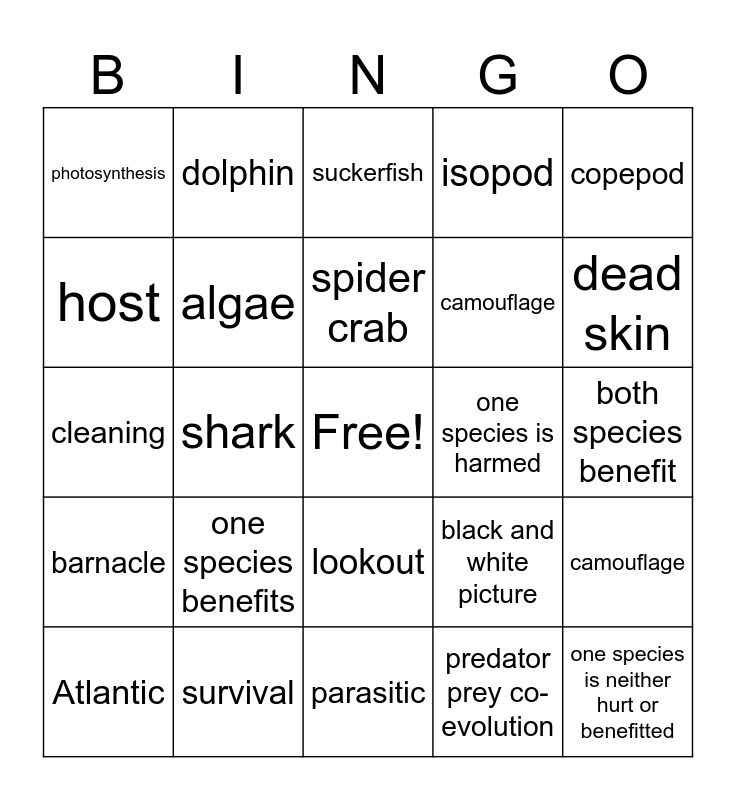 This bingo card has a free space and 24 words: one species benefits, survival, spider crab, Atlantic, copepod, photosynthesis, host, dolphin, one species is harmed, lookout, camouflage, cleaning, black and white picture, camouflage, algae, predator prey co-evolution, both species benefit, suckerfish, dead skin, shark, one species is neither hurt or benefitted, barnacle, isopod and parasitic.