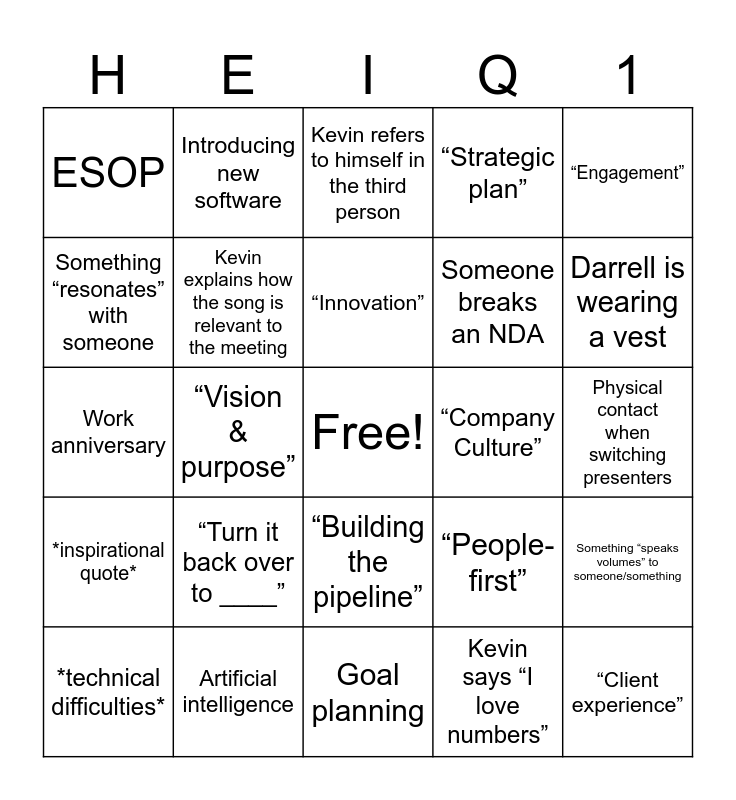 This bingo card has a free space and 39 words: #TeamHenderson, #OneHenderson, Kevin starts the meeting dancing to a song, Kevin explains how the song is relevant to the meeting, *technical difficulties*, “Building the pipeline”, “Innovation”, CEO thoughts, “Engagement”, *inspirational quote*, “Vision & purpose”, “Strategic plan”, “Client experience”, Physical contact when switching presenters, “Company Culture”, “Turn it back over to ____”, Core Values, ESOP, “workflow”, “People-first”, Something “resonates” with someone, Goal planning, Someone breaks an NDA, Darrell is wearing a vest, “_____ mindset”, “the power of _____”, National office update, Someone does air quotes, Someone mentions BINGO, Introducing new software, “complete transparency”, Book recommendation, Kevin refers to himself in the third person, Artificial intelligence, Kevin says “I love numbers”, “shoutout to ______”, Something “speaks volumes” to someone/something, Work anniversary and Retirement announcement.