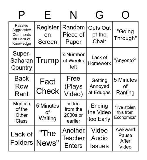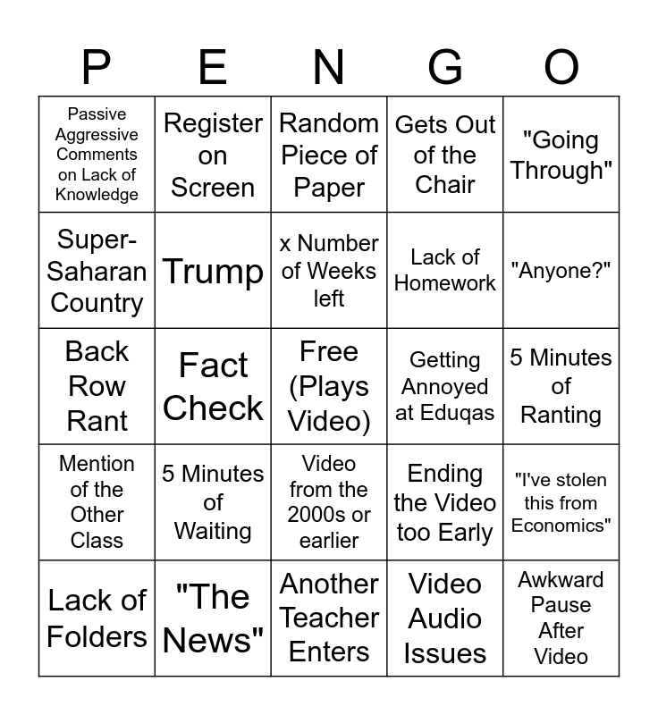 This bingo card has a free space and 24 words: 5 Minutes of Waiting, "The News", x Number of Weeks left, Lack of Folders, "Going Through", Passive Aggressive Comments on Lack of Knowledge, Super-Saharan Country, Register on Screen, Getting Annoyed at Eduqas, Video from the 2000s or earlier, Lack of Homework, Back Row Rant, Ending the Video too Early, "I've stolen this from Economics", Trump, Video Audio Issues, 5 Minutes of Ranting, Random Piece of Paper, "Anyone?", Fact Check, Awkward Pause After Video, Mention of the Other Class, Gets Out of the Chair and Another Teacher Enters.