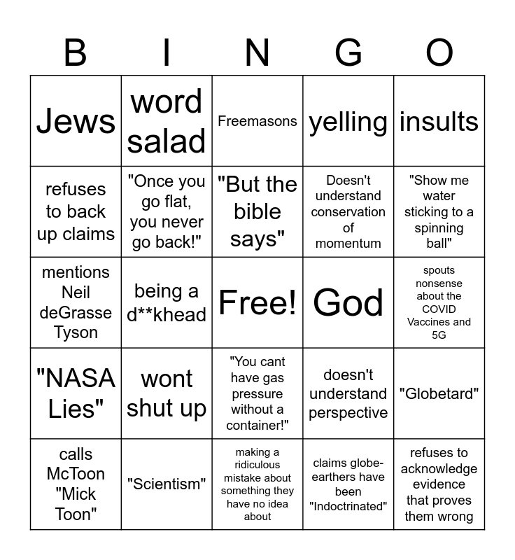 This bingo card has a free space and 24 words: wont shut up, "Scientism", "But the bible says", calls McToon "Mick Toon", insults, Jews, refuses to back up claims, word salad, God, "You cant have gas pressure without a container!", Doesn't understand conservation of momentum, mentions Neil deGrasse Tyson, doesn't understand perspective, "Globetard", "Once you go flat, you never go back!", claims globe-earthers have been "Indoctrinated", spouts nonsense about the COVID Vaccines and 5G, Freemasons, "Show me water sticking to a spinning ball", being a d**khead, refuses to acknowledge evidence that proves them wrong, "NASA Lies", yelling and making a ridiculous mistake about something they have no idea about.