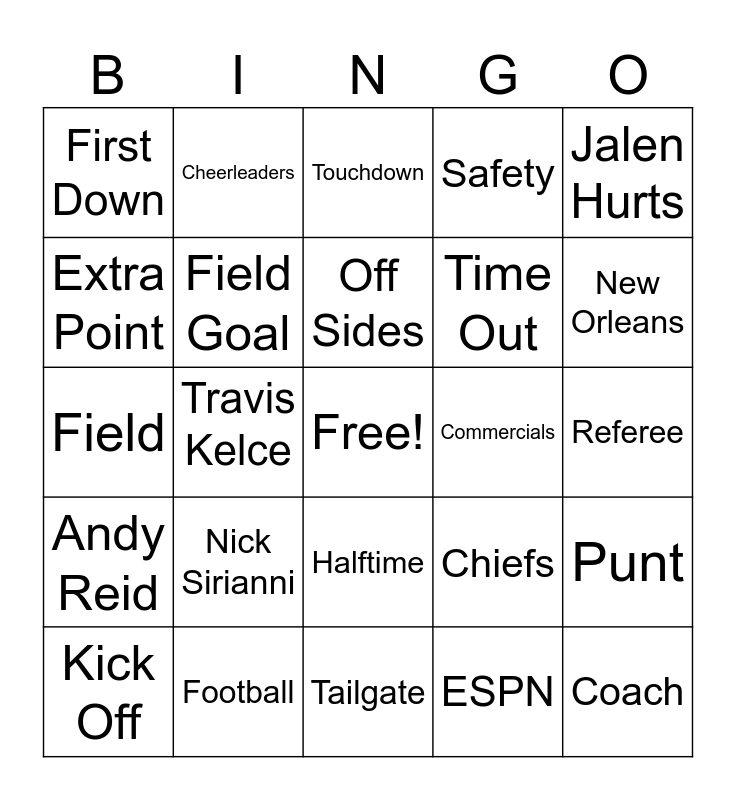 This bingo card has a free space and 30 words: Football, Patrick Mahomes, Travis Kelce, Taylor Swift, First Down, Touchdown, Field Goal, Halftime, Commercials, Tailgate, Referee, Coach, ESPN, Kendrick Lamar, New Orleans, Eagles, Chiefs, Andy Reid, Nick Sirianni, Jalen Hurts, Field, Penalty, Cheerleaders, Time Out, Extra Point, Safety, Punt, Kick Off, Off Sides and False Start.