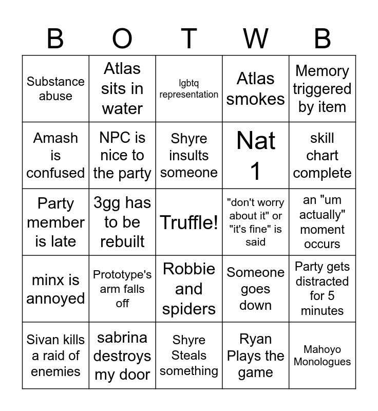 This bingo card has a free space and 47 words: The Party takes 30 minutes to star, Mahoyo Monologues, Ryan gets distracted, Shyre Steals something, Prototype's arm falls off, someone looses a limb, Atlas sits in water, Travel Gets interupted, Amash is confused, NPCs Dislike the party, NPC is nice to the party, Atlas smokes, Party gets distracted for 5 minutes, Someone goes down, Backstory is sad, Mahoyo Lies, Shyre insults someone, "don't worry about it" or "it's fine" is said, Dumb Memory, Memory triggered by item, 3gg has to be rebuilt, Ryan Plays the game, Substance abuse, Nat 1, Nat 20, skill chart complete, Sivan kills a raid of enemies, Yiga clan becomes a fork in road, Robbie and spiders, minx is annoyed, minx is horrified, chad and kyle die, movie reference, simultaneous talking, sticky note, sabrina destroys my door, an "um actually" moment occurs, Box of doom, speculation, "alternate reality", rule of cool, lgbtq representation, Party member is late, tv show reference, gaming!, Screw the rules I have logic and The party ruins god's plans.