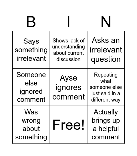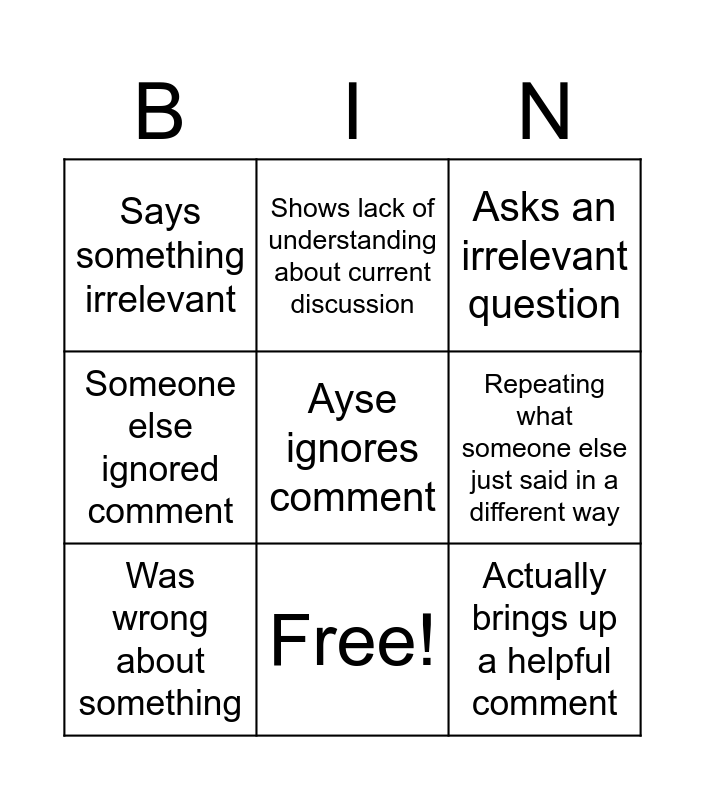 This bingo card has 10 words: Free!, Asks an irrelevant question, Says something irrelevant, Ayse ignores comment, Someone else ignored comment, Was wrong about something, Shows lack of understanding about current discussion, Shows lack of understanding about her work, Repeating what someone else just said in a different way and Actually brings up a helpful comment.