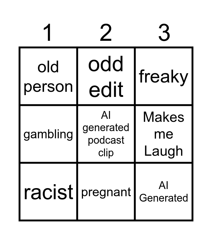 This bingo card has 9 words: racist, freaky, odd edit, gambling, old person, Makes me Laugh, AI generated podcast clip, AI Generated and pregnant.