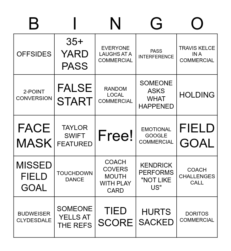 This bingo card has a free space and 29 words: BUDWEISER CLYDESDALE, MAHOMES SACKED, TAYLOR SWIFT FEATURED, INTERCEPTION, OFFSIDES, EVERYONE LAUGHS AT A COMMERCIAL, FALSE START, TOUCHDOWN DANCE, EMOTIONAL GOOGLE COMMERCIAL, SOMEONE YELLS AT THE REFS, FIELD GOAL, DORITOS COMMERCIAL, TIED SCORE, HURTS SACKED, HOLDING, TIMEOUT, COACH COVERS MOUTH WITH PLAY CARD, MISSED FIELD GOAL, TRAVIS KELCE IN A COMMERCIAL, FACE MASK, KENDRICK PERFORMS "NOT LIKE US", FUMBLE, SOMEONE ASKS WHAT HAPPENED, 2-POINT CONVERSION, PASS INTERFERENCE, 35+ YARD PASS, COACH CHALLENGES CALL, RANDOM LOCAL COMMERCIAL and SOMEONE CRIES.