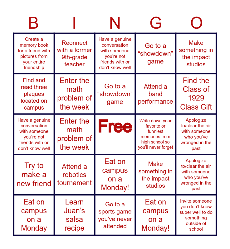 ⚠ This card has duplicate items: Attend a robotics tournament (3), Enter the math problem of the week (3), Make something in the impact studios (3), Try to make a new friend (3), Write a thank you note to an elementary school teacher (3), Learn to change a tire (3), Walk around all the KDS lakes (2), Find the name of a KDS piece of art and tell the artist you liked it! (2), Go to a sports game you’ve never attended (2), Go canoeing on the lake (2), Learn Juan’s salsa recipe (2), Eat on campus on a Monday! (2), Try something at the dining hall you’ve never had (2), Submit a piece to the literary magazine (2), Reonnect with a former 9th-grade teacher (2), Thank a Middle School teacher (2), Attend the Musical (Feb. 6, 7, 8) (2), Attend a band performance (2), Go to a “showdown” game (2), Have a genuine conversation with someone you’re not friends with or don’t know well (2), Apologize to/clear the air with someone who you’ve wronged in the past (2), Invite someone you don’t know super well to do something outside of school (2), Donate to the senior gift (2), Write down your favorite or funniest memories from high school so you’ll never forget (2), Create a memory book for a friend with pictures from your entire friendship (2), Reach out to a KDS alumn in a field you’re interested in pursuing (2), Go to the Denver Art Museum and take a picture with Duke Beardsley, A KDS parent and alumn’s painting “Against the bit” (2), Visit the newly renovated Denver Public Library (take a picture) and get yourself a library card (2), Give a Monday Monologue Speech at Assembly (2), Create a time capsule (2), Participate in an Assembly (2), Have lunch with 9th grader (2), Find the Class of 1929 Class Gift (2), Find and read three plaques located on campus (2)