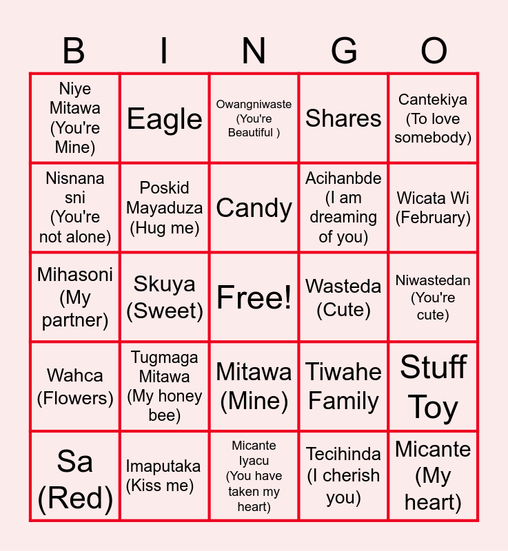 This bingo card has 29 words: Sa (Red), Wastechidake (I love you), Skuya (Sweet), Micante (My heart), Niye Mitawa (You're Mine), Owangniwaste (You're Beautiful ), Poskid Mayaduza (Hug me), Tugmaga Mitawa (My honey bee), Wasteda (Cute), Imaputaka (Kiss me), Niwastedan (You're cute), Free!, Micante Iyacu (You have taken my heart), Tecihinda (I cherish you), Wicata Wi (February), MiCante skuya (MySweet Heart), Mitawa (Mine), Wahca (Flowers), Cantekiya (To love somebody), Mihasoni (My partner), Tiwahe Family, Micante Sdo miye (You melt my heart), Acihanbde (I am dreaming of you), Nisnana sni (You're not alone), Shares, Eagle, Stuff Toy, Candy and Chocolate.