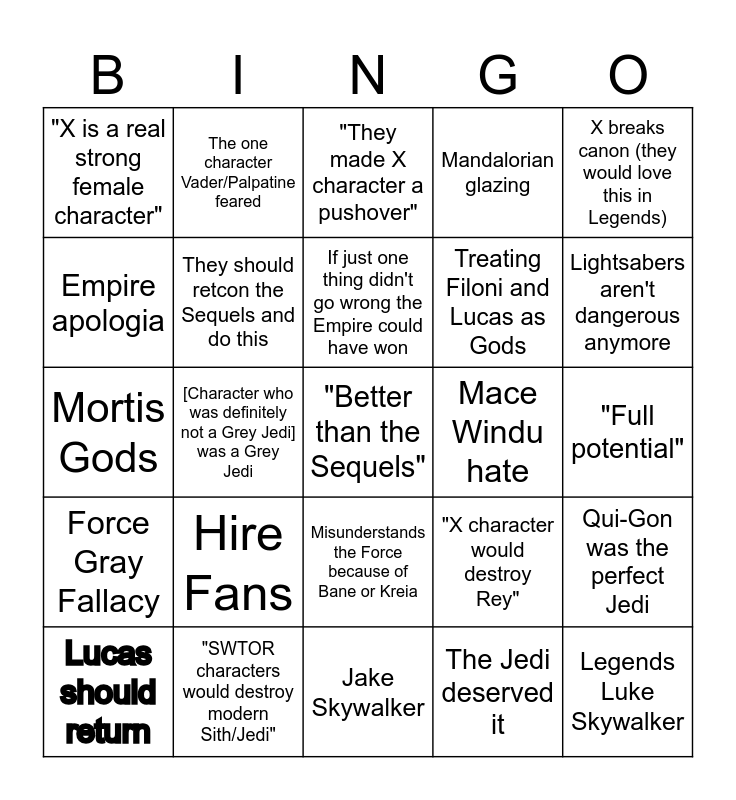 This bingo card has a free space and 29 words: Lucas should return, Refers to an event in "Legends" without further specification, [Character who was definitely not a Grey Jedi] was a Grey Jedi, "This will always be MY Canon", "X is a real strong female character", "They made X character a pushover", They should retcon the Sequels and do this, Hire Fans, Mace Windu hate, "SWTOR characters would destroy modern Sith/Jedi", "Full potential", Legends Luke Skywalker, Jake Skywalker, The Jedi deserved it, Lightsabers aren't dangerous anymore, Plo Koon glazing, Misunderstands the Force because of Bane or Kreia, Force Gray Fallacy, X breaks canon (they would love this in Legends), Mortis Gods, "X character would destroy Rey", X character is way better than [women/POC], Treating Filoni and Lucas as Gods, Empire apologia, Mandalorian glazing, The one character Vader/Palpatine feared, Qui-Gon was the perfect Jedi, If just one thing didn't go wrong the Empire could have won and Revan is the greatest character in all of Star Wars.