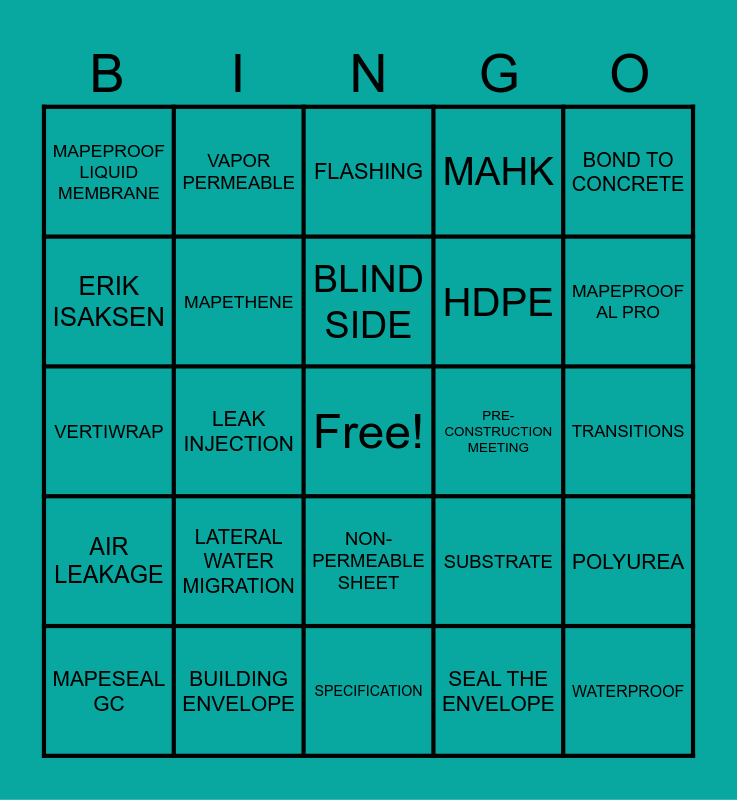 This bingo card has a free space and 24 words: LATERAL WATER MIGRATION, BUILDING ENVELOPE, BLIND SIDE, MAPESEAL GC, BOND TO CONCRETE, MAPEPROOF LIQUID MEMBRANE, ERIK ISAKSEN, VAPOR PERMEABLE, PRE-CONSTRUCTION MEETING, NON-PERMEABLE SHEET, HDPE, VERTIWRAP, SUBSTRATE, POLYUREA, MAPETHENE, SEAL THE ENVELOPE, TRANSITIONS, FLASHING, MAPEPROOF AL PRO, LEAK INJECTION, WATERPROOF, AIR LEAKAGE, MAHK and SPECIFICATION.