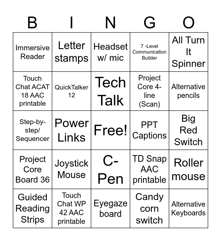 This bingo card has a free space and 41 words: Big Mack, Step-by-step/ Sequencer, iTalk 4, QuickTalker 12, Touch Chat WP 42 AAC printable, C-Pen, Tech Talk, Teach Speak, All Turn It Spinner, Project Core Board 36, Power Links, 7 -Level Communication Builder, Alternative Keyboards, Big Red Switch, PPT Captions, Joystick Mouse, Monarch Reader, Immersive Reader, Dictation/ Speech to text, Headset w/ mic, Roller mouse, Trackpad, Eyegaze board, Project Core 4-line (Scan), Head mouse, Wobble switch, Candy corn switch, Dycem, Alternative pencils, Raised lined paper, Forte, Letter stamps, Guided Reading Strips, Magnifying glass, TD Snap AAC printable, Touch Chat ACAT 18 AAC printable, Proloquo2Go AAC printable, General Communication Boards printable, AAC Language Lab, TD Core 1st Printable Books and Battery Interrupter.