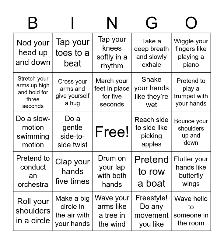 This bingo card has a free space and 25 words: Clap your hands five times, Wave your arms like a tree in the wind, March your feet in place for five seconds, Roll your shoulders in a circle, Wiggle your fingers like playing a piano, Nod your head up and down, Stretch your arms up high and hold for three seconds, Tap your toes to a beat, Reach side to side like picking apples, Drum on your lap with both hands, Shake your hands like they’re wet, Do a slow-motion swimming motion, Pretend to row a boat, Flutter your hands like butterfly wings, Cross your arms and give yourself a hug, Move your hands like windshield wipers, Bounce your shoulders up and down, Tap your knees softly in a rhythm, Pretend to play a trumpet with your hands, Do a gentle side-to-side twist, Wave hello to someone in the room, Make a big circle in the air with your hands, Pretend to conduct an orchestra, Take a deep breath and slowly exhale and Freestyle! Do any movement you like.