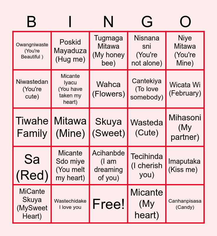 This bingo card has 25 words: Sa (Red), Wastechidake I love you, Skuya (Sweet), Micante (My heart), Niye Mitawa (You're Mine), Owangniwaste (You're Beautiful ), Poskid Mayaduza (Hug me), Tugmaga Mitawa (My honey bee), Wasteda (Cute), Imaputaka (Kiss me), Niwastedan (You're cute), Micante Iyacu (You have taken my heart), Free!, Tecihinda (I cherish you), Wicata Wi (February), MiCante Skuya (MySweet Heart), Mitawa (Mine), Wahca (Flowers), Cantekiya (To love somebody), Mihasoni (My partner), Tiwahe Family, Micante Sdo miye (You melt my heart), Acihanbde (I am dreaming of you), Nisnana sni (You're not alone) and Canhanpisasa (Candy).