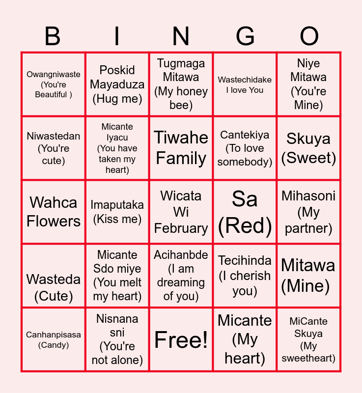 This bingo card has 25 words: Wasteda (Cute), Nisnana sni (You're not alone), Wicata Wi February, Micante (My heart), Niye Mitawa (You're Mine), Owangniwaste (You're Beautiful ), Poskid Mayaduza (Hug me), Tugmaga Mitawa (My honey bee), Sa (Red), Mitawa (Mine), Niwastedan (You're cute), Micante Iyacu (You have taken my heart), Free!, Tecihinda (I cherish you), Skuya (Sweet), Canhanpisasa (Candy), Imaputaka (Kiss me), Tiwahe Family, Cantekiya (To love somebody), Mihasoni (My partner), Wahca Flowers, Micante Sdo miye (You melt my heart), Acihanbde (I am dreaming of you), Wastechidake I love You and MiCante Skuya (My sweetheart).