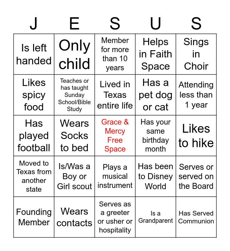 This bingo card has a free space and 24 words: Founding Member, Is/Was a Boy or Girl scout, Lived in Texas entire life, Is a Grandparent, Sings in Choir, Is left handed, Only child, Member for more than 10 years, Has your same birthday month, Likes to hike, Has played football, Teaches or has taught Sunday School/Bible Study, Has been to Disney World, Serves or served on the Board, Likes spicy food, Wears contacts, Serves as a greeter or usher or hospitality, Helps in Faith Space, Attending less than 1 year, Moved to Texas from another state, Wears Socks to bed, Plays a musical instrument, Has a pet dog or cat and Has Served Communion.