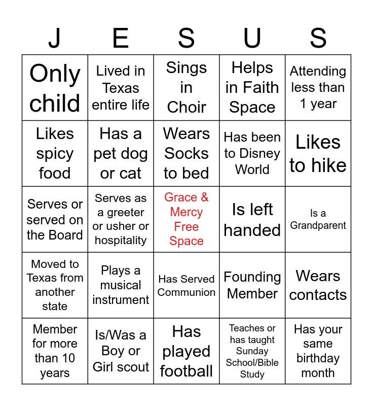 This bingo card has a free space and 24 words: Member for more than 10 years, Plays a musical instrument, Wears Socks to bed, Teaches or has taught Sunday School/Bible Study, Attending less than 1 year, Only child, Lived in Texas entire life, Sings in Choir, Is left handed, Is a Grandparent, Serves or served on the Board, Has a pet dog or cat, Founding Member, Wears contacts, Likes spicy food, Is/Was a Boy or Girl scout, Has played football, Helps in Faith Space, Likes to hike, Moved to Texas from another state, Serves as a greeter or usher or hospitality, Has Served Communion, Has been to Disney World and Has your same birthday month.