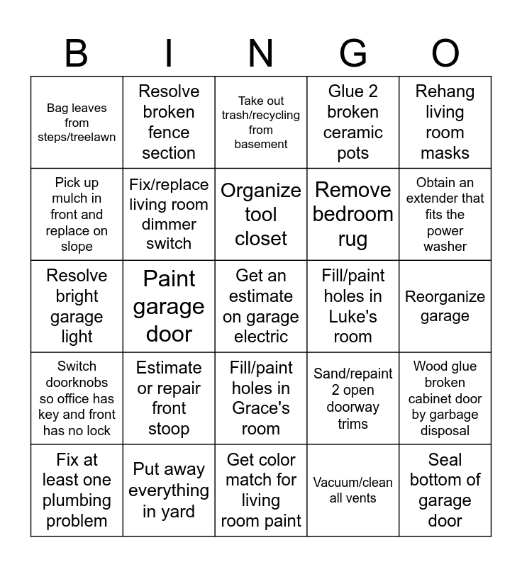 This bingo card has a free space and 24 words: Estimate or repair front stoop, Put away everything in yard, Organize tool closet, Fix at least one plumbing problem, Rehang living room masks, Bag leaves from steps/treelawn, Pick up mulch in front and replace on slope, Resolve broken fence section, Fill/paint holes in Luke's room, Fill/paint holes in Grace's room, Remove bedroom rug, Resolve bright garage light, Sand/repaint 2 open doorway trims, Wood glue broken cabinet door by garbage disposal, Fix/replace living room dimmer switch, Vacuum/clean all vents, Reorganize garage, Take out trash/recycling from basement, Obtain an extender that fits the power washer, Paint garage door, Seal bottom of garage door, Switch doorknobs so office has key and front has no lock, Glue 2 broken ceramic pots and Get color match for living room paint.