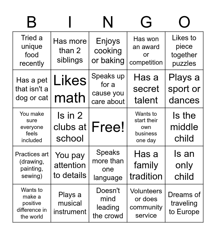 This bingo card has a free space and 24 words: You pay attention to details, Plays a musical instrument, Speaks up for a cause you care about, Wants to make a positive difference in the world, Likes to piece together puzzles, Tried a unique food recently, Has a pet that isn't a dog or cat, Has more than 2 siblings, Wants to start their own business one day, Speaks more than one language, Has a secret talent, You make sure everyone feels included, Has a family tradition, Is an only child, Likes math, Volunteers or does community service, Is the middle child, Enjoys cooking or baking, Plays a sport or dances, Is in 2 clubs at school, Dreams of traveling to Europe, Practices art (drawing, painting, sewing), Has won an award or competition and Doesn't mind leading the crowd.