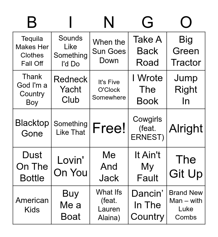 This bingo card has a free space and 40 words: This Bar, Blacktop Gone, Chicken Fried, Redneck Yacht Club, Buy Me a Boat, Me And Jack, It's Five O'Clock Somewhere, Rain Is A Good Thing, Big Green Tractor, Dust On The Bottle, Something Like That, Take A Back Road, Brand New Man – with Luke Combs, Alright, Cowgirls (feat. ERNEST), Lovin' On You, Single Than She Was, Tequila Makes Her Clothes Fall Off, Neon Star (Country Boy Lullaby), When the Sun Goes Down, The Git Up, Dancin’ In The Country, I Wrote The Book, Thank God I'm a Country Boy, My Truck (feat. Sam Hunt) - Remix, Short Skirt Weather, Happy Hour, I Don't Want This Night To End, Ain't No Love In Oklahoma (From Twisters: The Album), Relapse, Beachin', American Kids, When It Rains It Pours, It Ain't My Fault, Jump Right In, What Ifs (feat. Lauren Alaina), Castaway, 23, Sounds Like Something I'd Do and No Shoes, No Shirt, No Problems.
