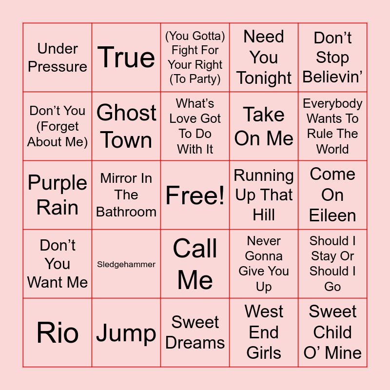 This bingo card has a free space and 39 words: Video Killed The Radio Star, Just Can’t Get Enough, Faith, Ghost Town, Rio, Call Me, What’s Love Got To Do With It, Push It, Don’t Stop Believin’, Don’t You Want Me, Mirror In The Bathroom, Need You Tonight, Sweet Child O’ Mine, Come On Eileen, Running Up That Hill, Sledgehammer, Girls Just Wanna Have Fun, Under Pressure, (She Sells) Sanctuary, Never Gonna Give You Up, Don’t You (Forget About Me), Sweet Dreams, Take On Me, Everybody Wants To Rule The World, It’s The End Of The World As We Know It, Born In The USA, Holding Out For A Hero, Beat It, In A Big Country, True, Every Breath You Take, I Still Haven’t Found What I’m Looking For, (You Gotta) Fight For Your Right (To Party), Jump, West End Girls, Love Shack, Should I Stay Or Should I Go, Purple Rain and Tainted Love.