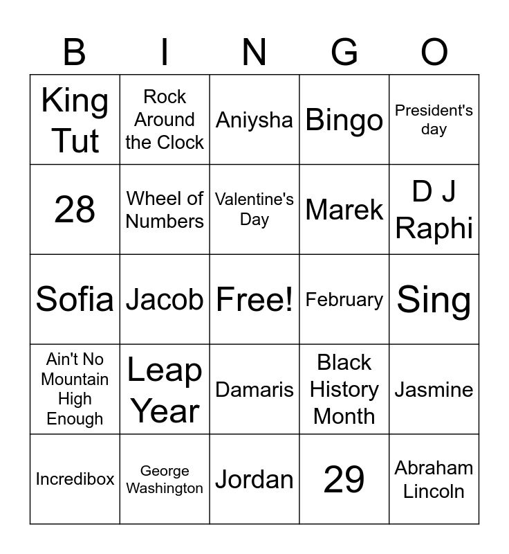 This bingo card has a free space and 24 words: Leap Year, George Washington, Valentine's Day, Incredibox, President's day, King Tut, 28, Rock Around the Clock, February, Damaris, Marek, Sofia, Black History Month, Jasmine, Wheel of Numbers, 29, Sing, Aniysha, D J Raphi, Jacob, Abraham Lincoln, Ain't No Mountain High Enough, Bingo and Jordan.
